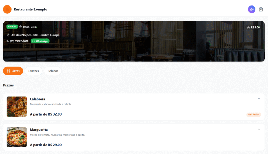 Interface responsiva acessada pelo cliente final através do navegador ou link direto. Otimizada para Mobile First. Atela inicial apresenta a identidade visual da loja. As categorias (Pizzas, Lanches) funcionam como filtros rápidos.