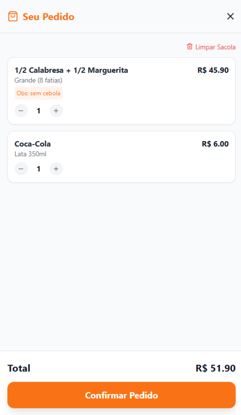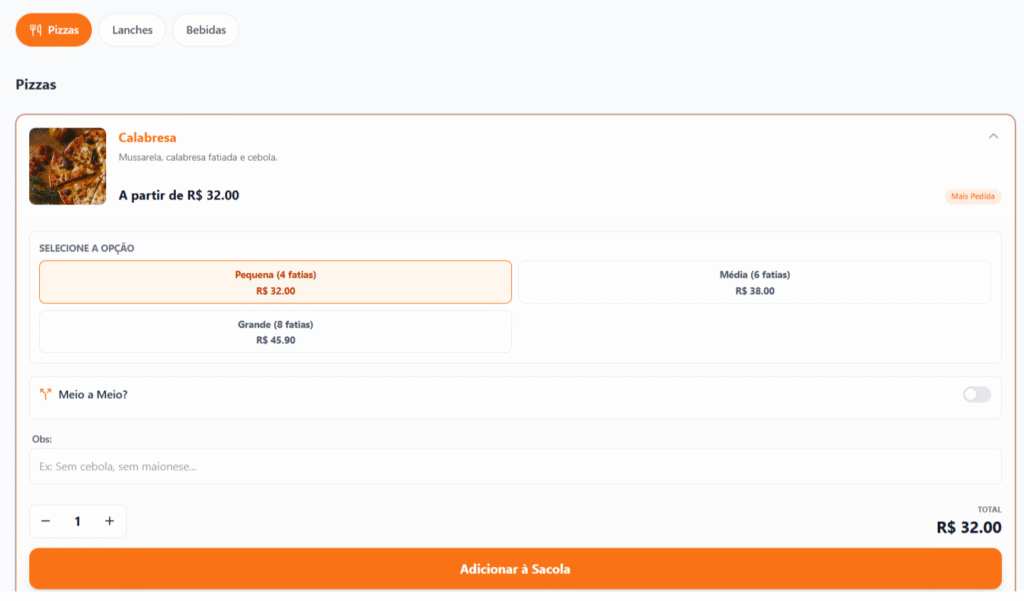 Ao selecionar um item, o modal de detalhes é aberto. Aqui reside a lógica complexa de ‘Meio a Meio’ e seleção de tamanhos, observações sobre o pedido